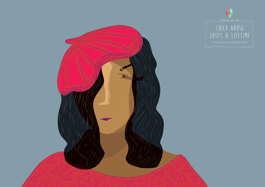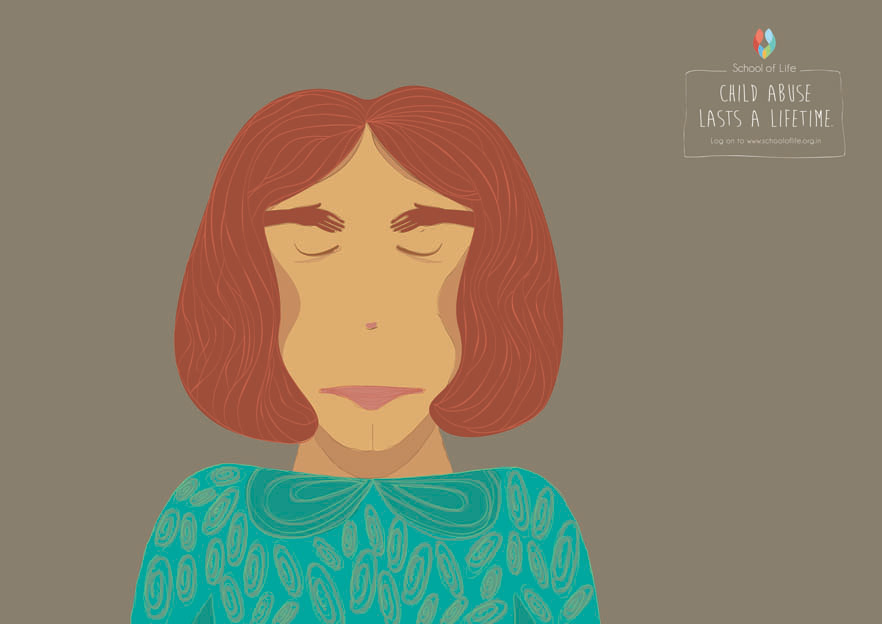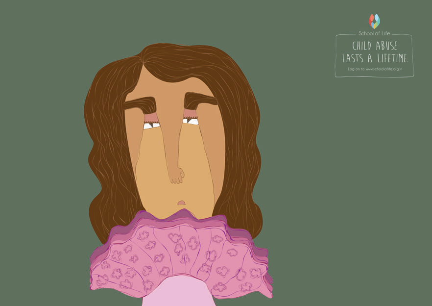 School of Life, is a NGO that aims to create a world free of abuse and violence against children. Their main challenge is lack of awareness. Child abuse is a still a taboo topic in India and parents tend to dismiss it – even though such incidents can scar a child for life. So, to start a conversation around this, we created posters that capture the loss of innocence in subtle yet tragic form. Child abuse, leaves a mark on the victim. It changes the way they see themselves and it never leaves them. While on the outside they seem normal, deep down the scars remain forever. This sad reality is depicted with the help of portraits of young girls illustrated in typical children’s picture book art style. But on closer inspection we see that their faces are made of the violent acts committed on them.